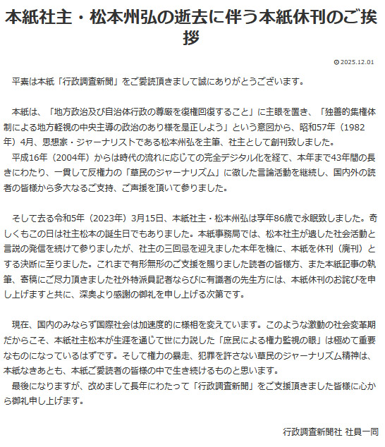本紙社主・松本州弘の逝去に伴う本紙休刊のご挨拶